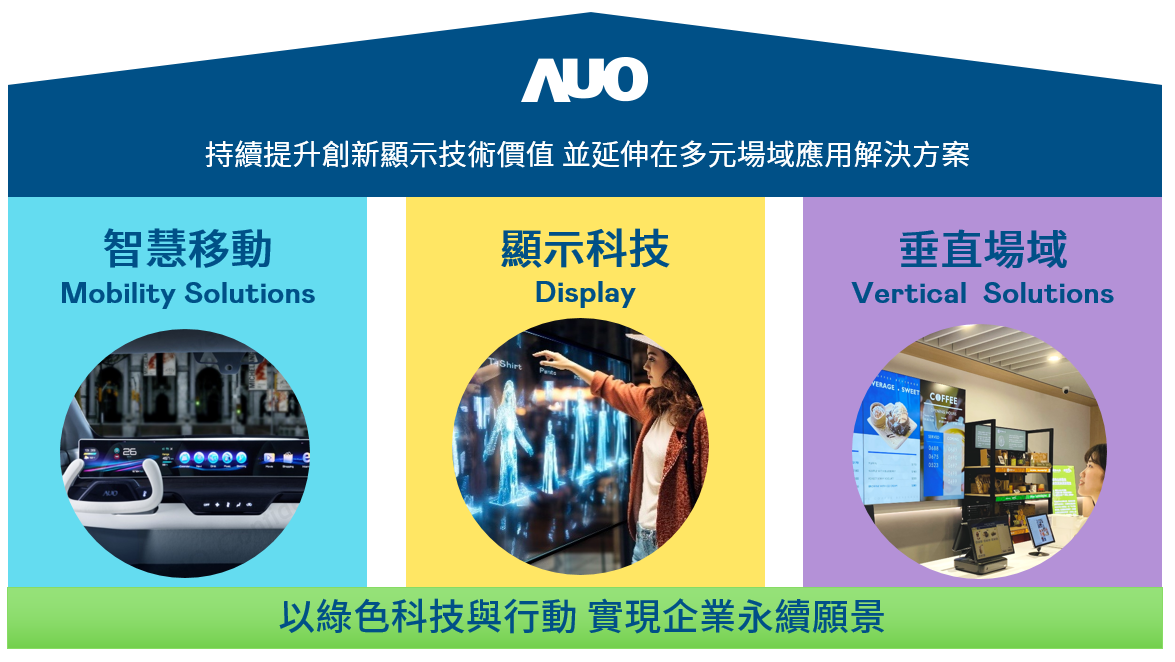 我們持續推動「雙軸轉型」,在精進顯示技術附加價值(Go Premium),與深化垂直市場應用(Go Vertical)的策略下,對應BJL平台的優勢競爭力與趨勢,我們奠定顯示技術智慧移動垂直場域三大永續營運支柱,在顯示技術領域的根基之上,延伸布局多元場域應用解決方案。將先進顯示科技助力智慧移動及垂直場域發展,並以綠色科技與行動為實踐,在轉型之路上貫徹永續經營之願景。